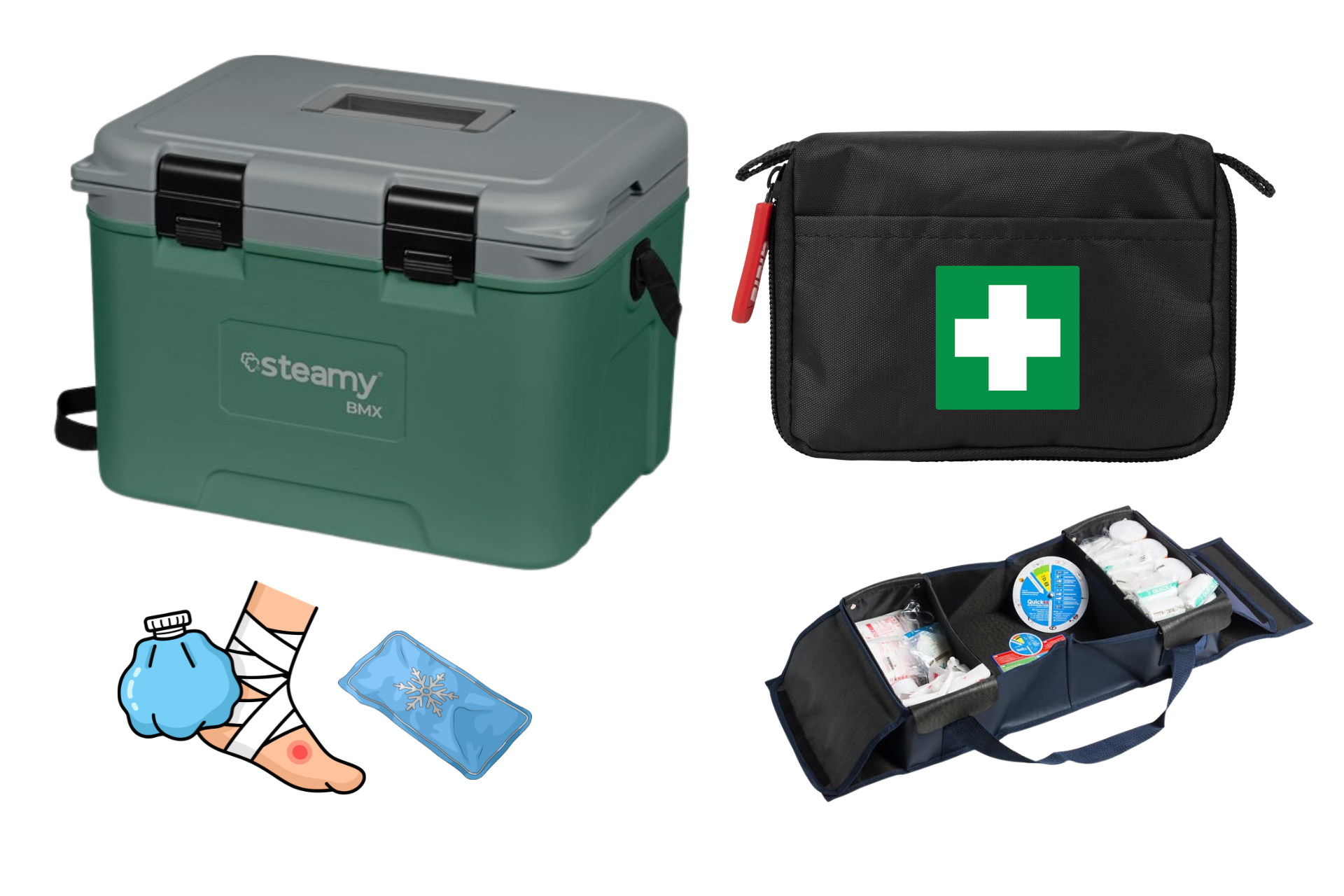 Het team dat als eerste op dit veld traint of een wedstrijd speelt neemt de koelbox met blessure-ijs mee naar het veld. De koelbox staat in de EHBO-kamer in het clubhuis. Vul de koelbox met minimaal 4 zakjes met ijs uit de vrieskist en doe er eenzelfde aantal zakjes met blauwe doekjes bij (deze wikkel je bij gebruik om het zakje met ijs).